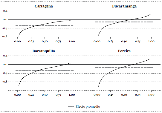 La figura 7 muestra el efecto de aumentar en 1 % en número de trabajadores por cuenta propia con respecto al número de empleados privados, que fue la categoría excluida. Nótese que para las ciudades de Cartagena y Barranquilla el efecto es invariablemente negativo y significativo al 5 %, mientras que para Bucaramanga y Pereira el efecto empieza a ser positivo a partir del cuantil 0,7. Que la gráfica tenga pendiente positiva significa que ser trabajador por cuenta propia reduce en mayor cuantía los ingresos de aquellos trabajadores en el extremo inferior de la distribución, de manera que su efecto sobre la escala es positivo. En resumen, ser trabajador por cuenta propia es una covariable que combina un efecto localización negativo con un efecto escala positivo. Esto es, aumentar el número de trabajadores por cuenta propia tendría el efecto de hacer reducir el ingreso laboral promedio y aumentar la desigualdad.