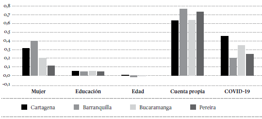Se analizan ahora los efectos escala específicos de las covariables por ciudad. El efecto escala mide el cambio en el cociente entre el cuantil 0,9 y el cuantil 0,1 proveniente de un aumento marginal en cada una de las covariables. En este sentido, el efecto escala mide la contribución de cada covariable a la desigualdad del ingreso laboral. En la figura 8 se presenta el efecto escala de cada una de las covariables incluidas, a excepción del sector económico. Los efectos de ser mujer, de la educación, de ser cuenta propia y de la pandemia por covid-19 sobre la distribución del ingreso son invariablemente regresivos, para todas las ciudades. Los efectos de la edad son significativos al 5 %, aunque cuantitativamente muy pequeños. El mayor efecto escala de ser mujer se da en la ciudad de Barranquilla, donde la escala de la distribución de las mujeres es un 40,03 % mayor que la correspondiente a los hombres. En Cartagena el efecto escala de ser mujer está 8,48 puntos porcentuales por debajo del de Barranquilla; en Bucaramanga la diferencia es de 19,83 puntos porcentuales; y en Pereira, de 28,76 puntos porcentuales. Así, tal y como lo concluimos a partir de la inspección gráfica de la figura 5, las diferencias en las desigualdades del ingreso entre hombres y mujeres son mayores en Barranquilla y Cartagena que en Bucaramanga y Pereira.