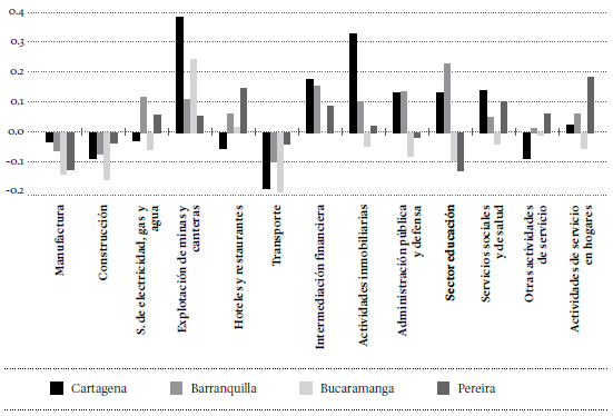 En cuanto a la distribución de los trabajadores por sectores económicos, la actividad más común en las cuatro ciudades es el comercio: representa en promedio un cuarto de los ocupados. Las siguientes actividades más comunes son la manufactura y el transporte, que representan el 17 % y el 11 % de los ocupados en promedio, respectivamente. Las diferencias más notorias son que en Cartagena el porcentaje de trabajadores en el sector de transporte está 4 puntos porcentuales por encima del promedio de las cuatro ciudades, y el porcentaje de trabajadores en el sector de manufactura está 4 puntos porcentuales por debajo del promedio de las cuatro ciudades; que en Bucaramanga el porcentaje de trabajadores en el sector de manufactura está 3 puntos porcentuales por encima del promedio de las cuatro ciudades; y que en Pereira el porcentaje de trabajadores en el sector de transporte está 3 puntos porcentuales por debajo del promedio para las cuatro ciudades.