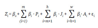 Esa literatura coincide en que el número de citas de cada artículo (Zi) se puede expresar como un componente promedio (ß o ), más la suma de variables de tres conjuntos: paper (P i ), journal (Ji) y grupo de autores (Ai), más un componente aleatorio (εi).
