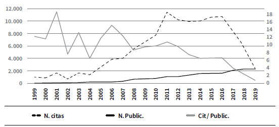 El detalle anual de la producción por años permite entrever crecimiento en número de publicaciones y citas entre 1999 y 2019. La cantidad de publicaciones pasó de 85 en 1999 a 2354 en 2019, un aumento de casi 27 veces (2669,4 %) en 20 años, consecuencia de que cada año se ha publicado más que en el anterior. A su vez, la citación total mostró variaciones entre 745 citas en 2002 y 11 458 citas para las publicaciones de 2011, el año de más citas, mientras que la citación anual promedio4 arrojó: disminución entre 2001 (18,26) y 2019 (0,96), cierta estabilidad en 2008 (8,52) y 2016 (6,52); y descenso sostenido en la citación desde 2014 (7,28) hasta 2019 (0,96) (ver Figura 1).
