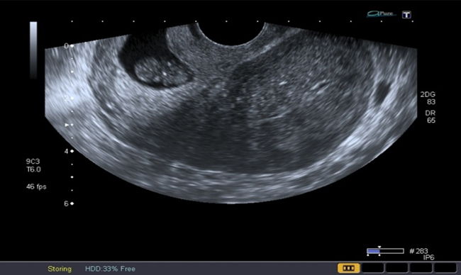 A los dos meses asistió a control y se le realizó una ecografía que mostró la presencia de una imagen hipoecoica heterogénea en la zona del istmo de 2 cm de diámetro en el labio anterior, sin presencia de embrión o saco gestacional (figuras 9 y 10).