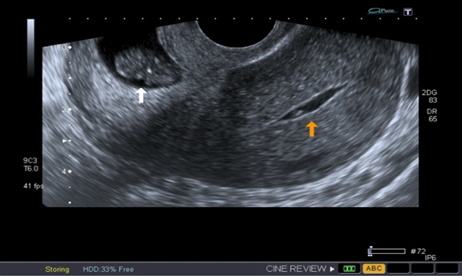 Figura 2 Presencia de cavidad endometrial vacía (flecha amarilla). Embarazo extrauterino cervical con embrión único sin actividad cardiaca (flecha blanca)