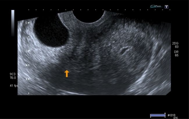 Figura 4 Orificio cervical interno cerrado (flecha amarilla), debajo del cual se evidencia la implantación del saco gestacional en la mucosa cervical