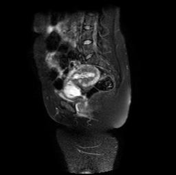 Figura 6 Imagen sagital de RMN en T2 con supresión grasa (SPIR) que muestra el saco gestacional limitado anteriormente por una banda de señal intermedia correspondiente a la reacción decidual y rodeada a su vez por el miometrio hipointenso