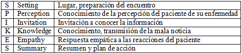 Presentaremos los pasos descritos en el protocolo SPIKES (26), desarrollado por el oncólogo Robert Buckman, en 1992 (tabla 1), dado que lo consideramos el más referenciado. Adicionalmente, hemos observado en nuestra experiencia hospitalaria que es ampliamente aplicable, útil y fácil de incorporar en la práctica.
