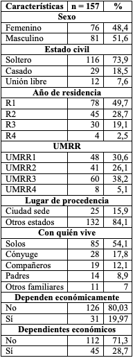 Participaron 157 residentes de un total de 238, pertenecientes a una zona, que cursaban diferentes especialidades. El 48,4 % eran mujeres y el 51,6 % eran hombres, con un rango de edad de entre 24 y 44 años (media = 29,05; DE = ±3,381). El 73,9 % estaba soltero; el 80,03 % mencionó ser independientes económicos; el 54,1 % dijo vivir solo; y el 71,3 % dijo no tener dependientes económicos; el 84,1 % proviene de diferentes estados de la República mexicana; el 38,2 % es de tercer año y el 26,6 % es de medicina familiar (tabla 1).