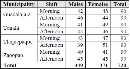 The study was carried out in schools with the following marginality indexes: school in the municipality of Tonalá, classified with a medium marginality index; Tlaquepaque, with a high index; Zapopan, with a medium index, and Guadalajara, with a low index (19). The sample consisted of 349 boys and 371 girls, corresponding to 180 students per school (Table 1).