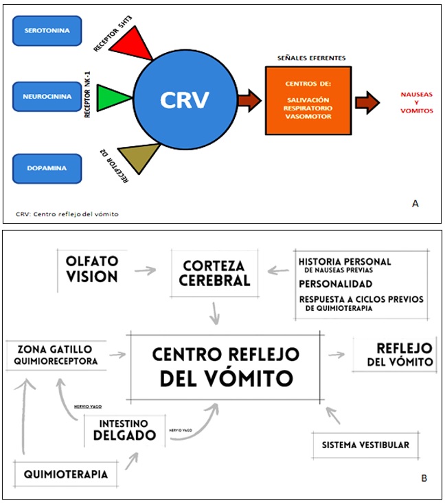 En el contexto de las NyV por quimioterapia, el CRV lo activan receptores serotoninérgicos (5HT), dopaminérgicos (D2) y de neurocinina (NK-1), a través de mediadores humorales, donde la estimulación de receptores 5HT3, 5HT2 y D2 está asociada al desarrollo de eventos de NyV agudos y a la estimulación de receptores NK-1, relacionada con episodios tardíos (4, 5).