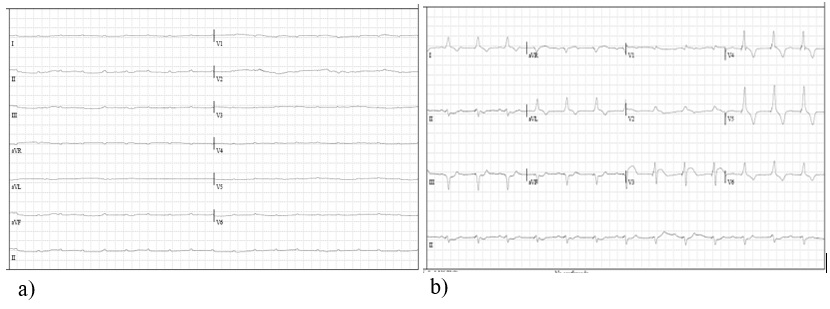 Figura 1. a) Electrocardiograma tomado al ingreso al servicio de urgencias. Presenta un bloqueo auriculoventricular de tercer grado, con un bajo voltaje evidente del complejo QRS. b) Electrocardiograma con marcapasos en modo VVI con electrodo en el ápice del ventrículo derecho con captura normofuncionante