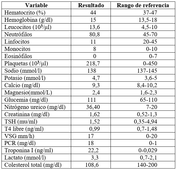 Al ingreso, el paciente continuó presentando síncopes convulsivos asociados en el electrocardiograma con un bloqueo auriculoventricular completo (figura 1); por ello, requirió la inserción de un marcapasos transvenoso. Dentro de los exámenes paraclínicos se obtuvo una leucocitosis leve con neutrofilia, troponina I positiva y proteína C reactiva elevada (tabla 1). La radiografía de tórax no mostró alteraciones y la tomografía axial computarizada de cráneo simple se reportó sin lesiones.