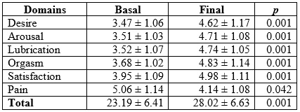 At the beginning of the study, the mean IFSF score was 23.19 ± 6.41 points (lower limit = 8.57 and upper = 29.38). At the end, the mean score reached 28.02 ± 6.63 points (lower limit = 10.52 and upper = 32.75), with statistically significant difference (p = 0.001). A 52.75 % of sexual dysfunctions were reported. It was found that 45.66 % presented 2, and 23.62 %, 3 or more concomitant sexual dysfunctions, with a median of 2 sexual dysfunctions per woman (range between 1 and ≥4). Hypoactive sexual desire was present in 31.49 % of the participants. When contrasting the IFSF domains between the measurement before therapy and at the end, a score of 3.47 ± 1.06 vs. 4.62 ± 1.17 (p < 0.05) was observed in the desire domain. Regarding lubrication, the score was 3.52 ± 1.07 vs. 4.74 ± 1.05 (p < 0.05) (Table 4).