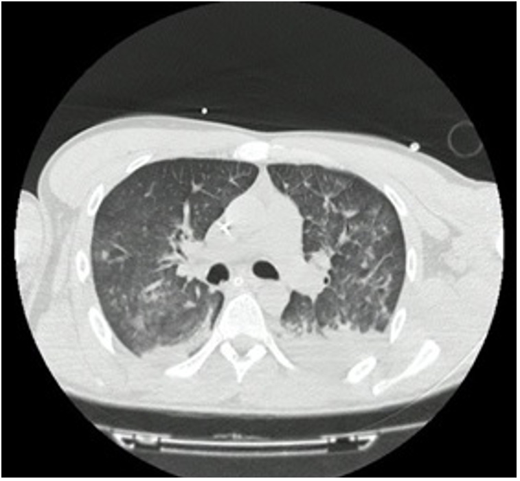 Figura 1 Tomografía de tóraxSe aprecia un engrosamiento liso de los tabiques interlobulillares asociados con opacidades en “vidrio esmerilado” centrales y consolidaciones difusas, principalmente en las zonas dependientes. Engrosamiento de las paredes bronquiales. Derrame pleural bilateral