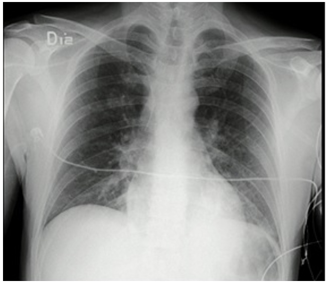 Frente a dichos resultados, se decidió trasladar al paciente a la unidad de cuidados intensivos para continuar el manejo médico con soporte ventilatorio. Por los hallazgos radiológicos de “vidrio esmerilado”, se le tomó la prueba de reacción en cadena de la polimerasa para SARS-CoV-2 en el contexto de pandemia, cuyo reporte fue negativo. Al ser valorado por el servicio de toxicología, este consideró que el cuadro, probablemente, se relacionaba con el consumo de cocaína. Luego de permanecer durante 48 horas con soporte ventilatorio, el paciente logró mejoría clínica, paraclínica y radiológica (figura 2), por lo que fue extubado sin complicaciones, con evolución favorable. Luego de ello se indicó su traslado a la unidad de hospitalización de psiquiatría, de donde egresó siete días después de su ingreso a urgencias.