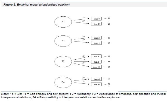 The revealed dimensions not correlated significantly with each other, except for the significant (p<.05, two-tailed tests) but quite irrelevant correlation between factor 2 "Autonomy" and factor 4 "Responsibility in interpersonal relations and self-acceptance" (r = .120). Both the correlation between factor 1 "Self-efficacy and self-esteem" and factor 2 "Autonomy" and the correlation between factor 1 "Self-efficacy and self-esteem" and factor 3 "Acceptance of emotions, self-direction and trust in interpersonal relations", although statistically significant (p<.01, two-tailed tests), were very weak (r = .185 and r = .177, respectively) (see Table 3).
