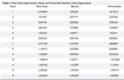 The number of factors to be extracted was determined performing random data parallel analyses (Horn, 1965). The eigenvalues derived from the actual data were compared to the eigenvalues derived from the random data. Factors were retained as long as the ith eigenvalue from the actual data was greater than the ith eigenvalue from the random data (O' Connor, 2000). Both Kaiser's (1960) criterion and the scree test (Cattell, 1966) were checked for agreement. Salience was detected applying the following two criteria: (1) a factor loading of at least .30 on the primary factor, ensuring a high degree of association between the item and the factor, (2) a difference of .30 between loading on the primary factor and loading on other factors for double-loading items, ensuring that each item could be considered salient to one factor (Tabachnick & Fidell, 1996). The standard Pearson product moment correlation coefficient was used to investigate to what extent the factor scores were intercorrelated.