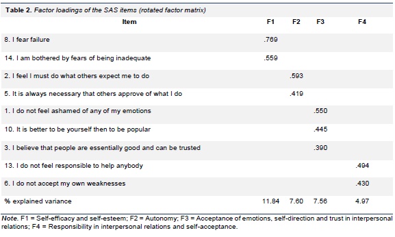 The first factor "Autonomy or self-direction", consisting of six items (item 2 "I feel I must do what others expect me to do", item 5 "It is always necessary that others approve of what I do", item 9 " I avoid attempts to analyze and simplify complex domains", item 10 " It is better to be yourself than to be popular", item 11 " I have no mission in life to which I feel especially dedicated", item 13 " I do not feel responsible to help anybody"), had a Cronbach's alpha of .399, which can be considered to be undesirable; the second factor "Autonomy or self-direction", involving three items (item 6 "I don't accept my own weaknesses", item 8 "I fear failure", item 14 "I am bothered by fears of being inadequate"), had a Cronbach's alpha of .570, which can be considered to be undesirable; the third factor "Acceptance of emotions and freedom of expression of emotions", consisting of two items (item 1 "I do not feel ashamed of any of my emotions", item 4 "I feel free to be angry at those I love"), had a Pearson's r = .044 (p = .521); the fourth factor "Trust and responsibility in interpersonal relations", consisting of three items (item 3 "I believe that people are essentially good and can be trusted", item 13 "I do not feel responsible to help anybody", item 15 "I am loved because I give love"), had a Cronbach's alpha of .246, which can be considered to be undesirable; the fifth factor, comprising two items (item 7 "I can like people without having to approve of them", item 12 "I can express my feelings even when they may result in undesirable consequences"), had a Pearson's r = .018 (p = .792). These values are considered unacceptable and indicate poor internal consistency.