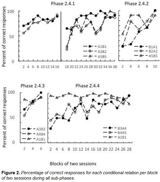 After completing the four experimental sub-phases, we compared the acquisition of symmetry-consistent and symmetry-inconsistent conditional discriminations (sub-phases 2.4.2 and 2.4.4). Faster acquisition of symmetry-consistent conditional discrimination (sub-phase 2.4.2) compared with the acquisition of symmetry-inconsistent conditional discrimination (sub-phase 2.4.4) would demonstrate the property of symmetry in conditional baseline relations.