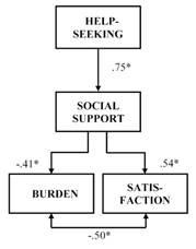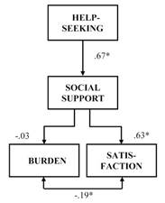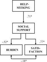 Figure 1 Structural equation model for the prediction of satisfaction through social support, help-seeking, and burden in the social-media caregivers. Note. Model: χ2(6, N = 157) = 10.88, p = .09; RMSEA = .056 (CI 90%: .001-.109), CFI = .986, NFI = .971. *p < .01.