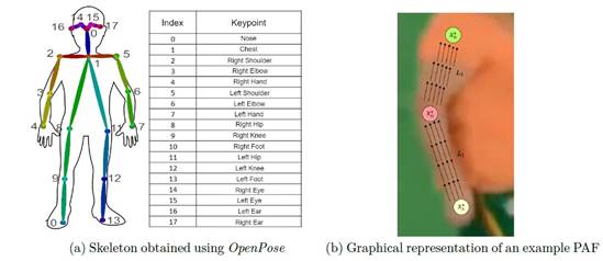 A main contribution of this work is to use markerless setups to avoid the limitation of marker-based configurations. Hence, OpenPose(Cao et al., 2021) architecture was used as a pose estimator from gait videos to extract intermediate features. This network is widely used in the literature for estimating key joint points during movement and actions for one or several persons in a scene. Formally, OpenPose architecture use an image IG R wxh where a posture will be extracted (P E N J and J E {ji, j-2, • • •, jn} represents the set of n body joints). This network use only 18 articular points (| J\ = 18), as showed in the Figure 2a. These joint points allow summarize the dynamics of a particular subject during locomotion. Specifically, each input image I is processed through convolutional layers ’J'(I) to obtain a set of deep activations F, which are further processed through two branches: Part Affinity Fields (L) and Joint Confidence Maps (S). These maps and vector fields are processed through bipartite matching resulting in the association of body joints with articular locations giving us the skele ton shown in Figure 2a.