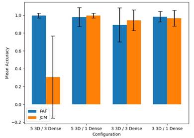 As observed in Figure 4, the intermediate PAF rep resentation yields consistent and robust results across different configurations of the trained architecture. PAF vector maps can influence the pose orientations, which may serve as a characteristic pattern allowing the net work to discriminate between the two study populations. On the other hand, the J CM representation exhibits a limited performance in the architecture with 3 dense layers. This could be attributed to the limited train ing data, particularly in the case of JCM maps, which provide reduced information regarding attention maps around the joints.