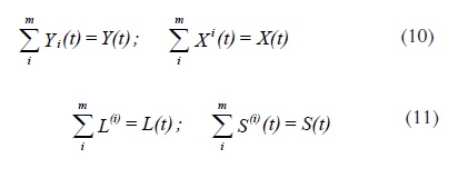 Siguiendo una sumatoria de los "m" sub-sistemas, el resultado es el sistema económico en su totalidad. La multiplicación del vector de empleo (a[n] ) por una matriz inversa tipo Leontief (I-AΘ)-1 hecha en la ecuación (8) es "v" y la multiplicación de la matriz de acervos de capital (A) por la misma matriz inversa hecha en la ecuación (9) es "H", esto es: