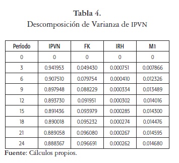 Dando nuevamente una mirada a la selección de impulsos-respuestas que representan las relaciones de mayor interés, se observan comportamientos similares a los encontrados en el primer ejercicio. La respuesta de los precios de la vivienda a los movimientos de la liquidez y los flujos de capital se da nuevamente en los primeros trimestres, sin embargo, en esta ocasión la volatilidad de largo plazo en el precio de las unidades del sector residencial es explicada en mayor medida por los flujos de recursos externos, tal como se aprecia en la tabla 4. La variable FK explica cerca del 10% después de 18 trimestres, lo que supone una cantidad considerablemente superior al ejercicio previo.