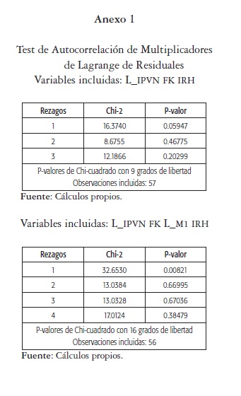 Finalmente, como prueba de validación se realizaron diversos tests que permitieron concluir que los residuales de los modelos VEC estimados en el presente trabajo son de media cero y no presentan autocorrelación. A pesar de no cumplir con la condición de normalidad, se puede decir que cumplen las condiciones necesarias para aprobar la metodología seguida.