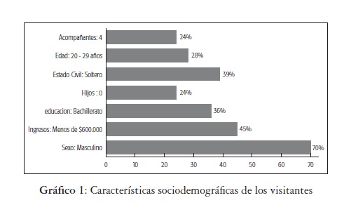 Los visitantes encuestados que visitaron todas las playas de Santa Marta tienen el siguiente perfil: en su mayoría hombres, de los cuales el 45% presentan ingresos inferiores a $600.000; el 36% presentan nivel de educación bachillerato y el 24% universitario; 39% solteros, sin hijos 28% en rango de edad comprendido entre 20 y 29 años, que viaja acompañado de 4 personas.