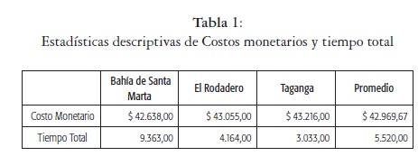 En promedio el costo por visita es de $42.967, que resulta una cifra aparentemente elevada, pero vale la pena resaltar que para el cálculo de estos costos totales se tiene en cuenta el costo de oportunidad del tiempo. Por su parte, el tiempo total viene medido en minutos y entre los componentes de su cálculo se introducen el número de visitas por año. Como se observa en la tabla 1, los turistas permanecen mayor tiempo en promedio en la bahía con respecto a Taganga y El Rodadero.