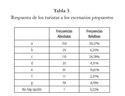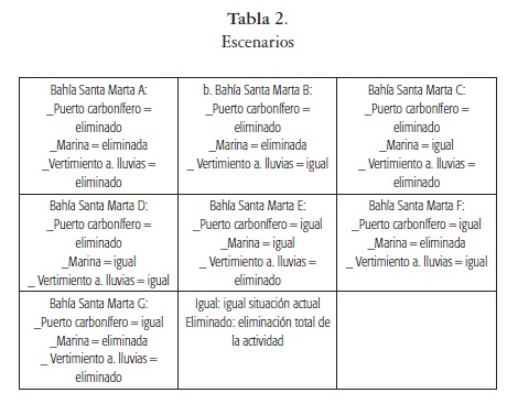 Los escenarios se comparan con respecto al escenario g, el cual propone la eliminación de la marina, así como el vertimiento de aguas lluvias, permaneciendo el puerto carbonífero igual. Los resultados de las estimaciones determinan que quienes escogieron el escenario a (eliminación de los tres factores), tienen 37,12% más probabilidad de realizar una nueva visita que quienes seleccionaron el escenario g. Por su parte, quienes seleccionaron el escenario b (eliminar el puerto carbonífero y marina, pero dejar igual el vertimiento de aguas lluvias) presentan 27,92% menos probabilidad de realizar una visita que quienes seleccionaron el escenario g. Para los escenarios c, d, e y f, las probabilidades de realizar una visita con respecto al escenario g son 31,37%, 60,66%, 26,85% y 70,95%, respectivamente.