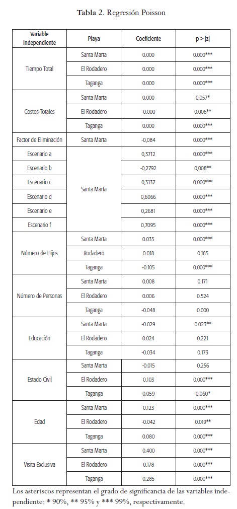 Para las tres playas estudiadas se observa que el tiempo de permanencia resulta altamente significativo. A pesar de que los coeficientes son cero se presenta causalidad, esto debido a que existe una relación directa entre el número de visitas y el tiempo de permanencia en la playa. Por su parte, los costos en los que incurren los visitantes también resultaron significativos, pero los coeficientes son cero. Sin embargo, la significancia de la causalidad implica que en el caso de Taganga la relación es más fuerte. Para los visitantes de El Rodadero, la relación entre los costos y el número de visitas es inversa, según lo esperado por la teoría económica; pero para la bahía de Santa Marta y Taganga el signo no fue el esperado. Lo anterior se puede explicar debido a que existen variables inobservables que no fueron captadas por el modelo.