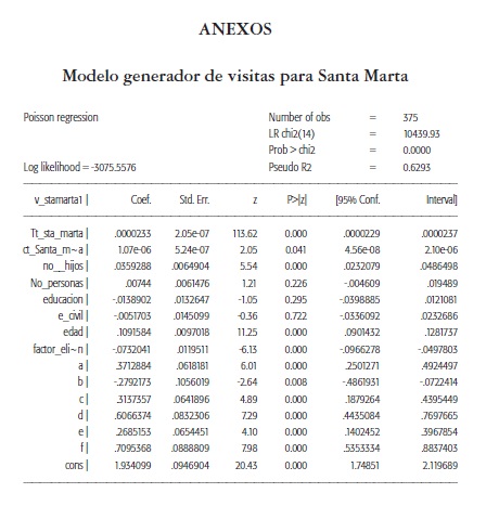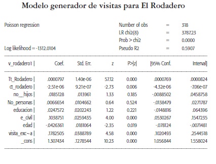 La relación que se estudia es el efecto que generan las variables socio demográficas del visitante, los costos totales y el tiempo total que dedica el visitante al disfrute de las playas. Debido a que la variable estudiada corresponde al número de visitas realizadas en el lapso de un año, se sugiere la aplicación de una regresión Poisson o un modelo Tobit (Cameron & Trivedi, 1998; Haab & McConnel, 1996; Scarpa et al., 2003; Tempesta et al., 2002; Thiene, 2003 citados por Tempesta & Thiene, 2006). Se evaluaron los modelos Poisson y Tobit, encontrando mejores resultados con el modelo Poisson.
