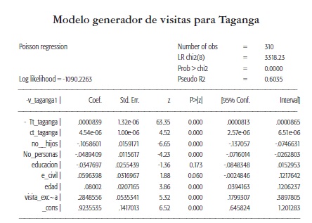 Tomando como referencia la distribución de Poisson se modela el valor esperado del número de visitas a las playas, condicionado por las variables que incluye el método de costo de viaje y las características sociodemográficas del entrevistado.
