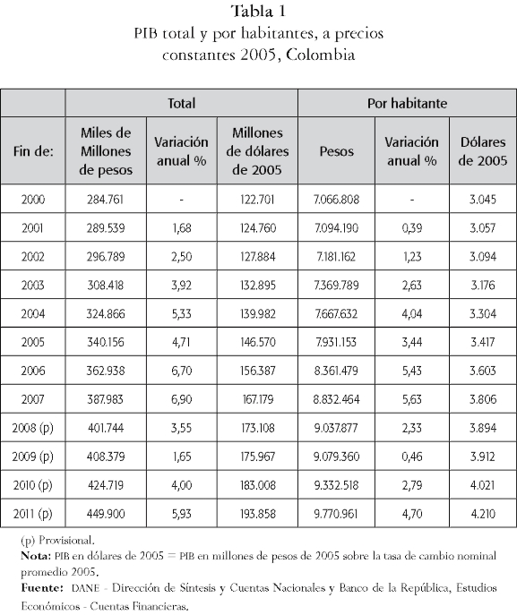 1 Cálculo realizado por el autor con base en los datos del PIB a precios constantes en el periodo 2004- 2007. Para promediar se utilizó la media geométrica. Fuente: Banco de la República.