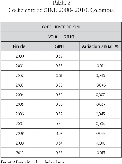 La inequidad en la distribución del ingreso se medirá a través del Coeficiente de GINI (tabla 2). De acuerdo con las cifras tomadas del Banco Mundial, el Coeficiente de GINI durante la década muestra que la tendencia de inequidad que existe en Colombia alcanza niveles que van desde 0,56 en el año 2005 y 2010, hasta 0,61 en el 2002, pese al crecimiento de la economía. Esto evidencia que Colombia es un país desigual, tanto así, que la meta según el Departamento Nacional de Planeación (DNP) para el 2014 es lograr tener un Coeficiente de GINI de 0,54 que, comparado con el promedio actual de América Latina, correspondiente a 0,53, aún se sitúa por encima, razón por cual Colombia se constituye como uno de los países más desiguales del mundo al estar los ingresos concentrados en pocas manos (Rodríguez, 2011).