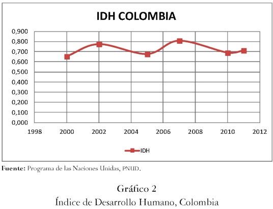 En ese sentido, la descripción de las cifras del IDH de Colombia, durante el periodo 2000 y 2010, muestra que ha tomado valores que oscilan entre 0,60 y 0,80, situándose en el grupo de países que poseen un IDH Alto.