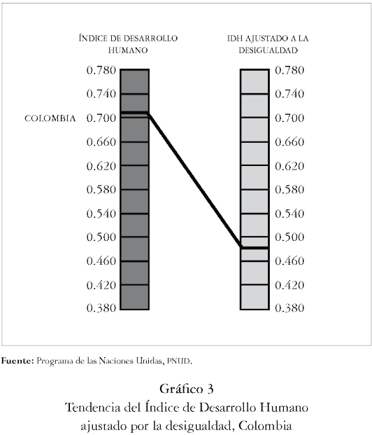 Sin embargo, si se analiza el Índice de Desarrollo Humano ajustado a la Desigualdad (IDH-D6), la tendencia en Colombia ha mostrado valores bajos para este indicador, y una gran diferencia con el IDH, lo cual refleja nuevamente la desigualdad del país con respecto al acceso a los servicios de salud, educación y en niveles de ingresos. Si se proyecta el indicador de acuerdo con estándares del Programa de las Naciones Unidas, en el que se establece que la desigualdad causa una pérdida en promedio del 23% de este, significaría que para Colombia, que hoy se sitúa en el puesto 87, con un IDH de 0,710, podría tener un IDH de 0,547, pasando de la categoría de IDH Alto a IDH Medio (gráfico 3).