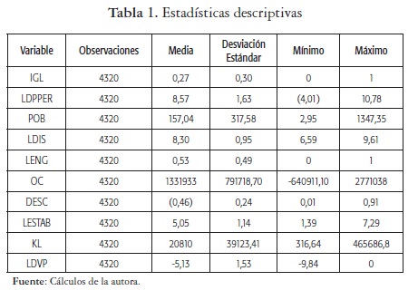 Algunas estadísticas descriptivas de las variables seleccionadas se presentan a continuación:
