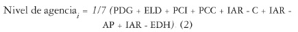 Se calcula el nivel de agencia de cada individuo como un promedio de los siete subíndices que integran el índice de agencia; en ausencia de un valor de referencia, el valor hallado se adopta como tal para cada individuo a partir de la siguente ecuación: