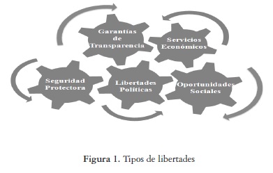 El enfoque de las capacidades humanas está constituido por cinco tipos de libertades: 1) las libertades políticas, 2) los servicios económicos, 3) las oportunidades sociales, 4) las garantías de transparencia y 5) la seguridad protectora. Cabe decir que la principal característica de las libertades instrumentales es el grado de complementariedad e interconexión que existen entre estas. Dicha característica se muestra en la figura 1.