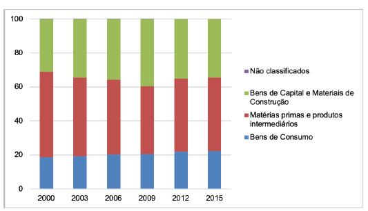 Gráfico 3 Participação percentual das importações segundo classificação CUODE 2000-2015, para anos selecionados