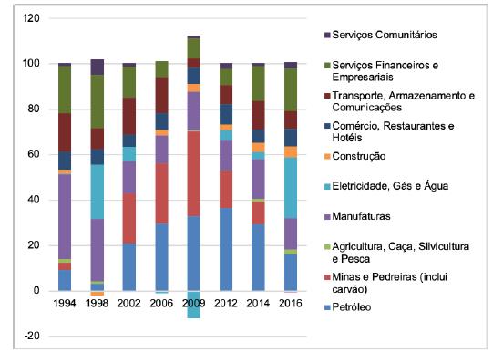 Por sua vez, o IDE direcionado para o setor da mineração apresentou comportamento similar: a partir de 2002 ultrapassa os US$ 460 milhões, atingindo quase US$ 2.500 milhões em 2012, quando começa a ter um declínio por causa da queda subsequente dos preços das commodities. Juntando os dois setores (mineração e petróleo), o gráfico 4 indica que eles passaram de representar 42,8% do IDE total em 2002 para 70,3% em 2009, quando atingiram a maior participação percentual no período analisado. Por último, o setor das manufaturas, que percebia 37,1% do IDE em 1994, caiu para 14% em 2016.