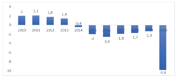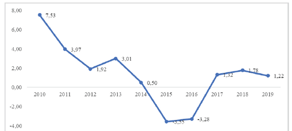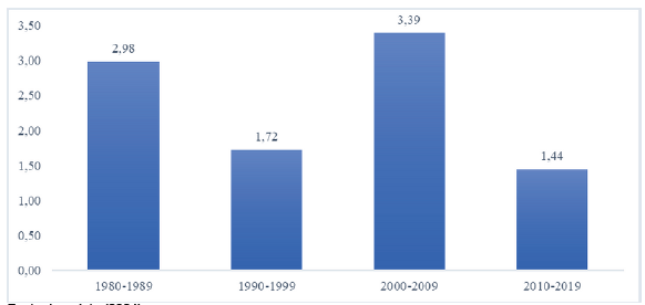 O esperado era que esse crescimento continuasse na década seguinte, uma vez que a taxa de crescimento em 2010 foi de 7,5%. No entanto, quando se compara o crescimento médio entre 2010 e 2019 com as últimas três décadas, verifica-se uma média mais baixa, de apenas 1,44%, como pode ser visto na Figura 1[18].