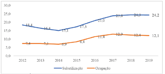 A taxa de subutilização é especialmente útil porque inclui não apenas os desempregados, mas também aqueles que estão subocupados por insuficiência de horas trabalhadas e os desalentados, que desistiram de procurar emprego devido à falta de oportunidades. Portanto, é mais abrangente e capaz de retratar não apenas o desemprego aberto como também aquele oculto. A trajetória dessa taxa é similar à da taxa de desocupação, mas com aumentos percentuais maiores de uma para outra, o que significa um agravamento no mercado de trabalho, ou seja, um número considerável de pessoas desempregadas, subocupadas por insuficiência de horas e desalentadas.