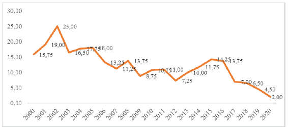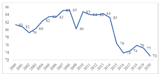 Entre 2010 e 2019, o Brasil apresentou uma taxa de crescimento média de 1,44%, o que permitiu questionar se esse período pode ser também denominado de década perdida. Os problemas econômicos não são os mesmos, uma vez que a inflação esteve controlada e não houve crises de balanço de pagamentos por escassez de reservas internacionais. Mas a crise fiscal e financeira do Estado, evidenciada pela diminuta arrecadação e pela incapacidade de reverter o déficit público, associada às complicações externas resultantes da instabilidade na geopolítica internacional, juntamente com uma taxa de formação bruta de capital fixo em relação ao PIB insuficiente e uma alta taxa de desemprego, foram os principais problemas econômicos da década. Além da crise econômica, houve a crise política com o impeachment da Presidente Dilma e os escândalos de corrupção revelados pela Lava Jato, que paralisaram a construção civil no país[29]. Em seguida, a eleição de Bolsonaro que sucedeu Temer na Presidência, alterando a política econômica dos governos do Partido dos Trabalhadores (PT). Todavia, a baixa taxa de crescimento nesse período se deve mais às escolhas de políticas econômicas do que aos condicionantes externos, dada a abundância de liquidez internacional e as vultuosas reservas.