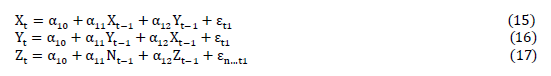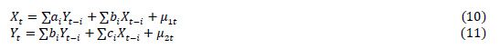 The two equations above represent causality relationships in the Granger sense, μ it , in theory, incorporating uncorrelated noise. In equation (10), it is assumed that the current values of the variable X t are linked to the past values of the variable X t _ 1 , as well as to the lagged values of the variable Y t . In equation (11), represented by Y t , a similar pattern is reflected, where the current values of Y t are related to the lagged values of the variable Y t _ 1 , as well as to the lagged values of the first variable X t . Thus, Granger causality can be identified in the series used in this work as unidirectional and bidirectional.