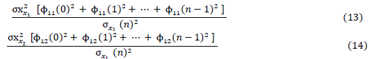 Where, σx𝑥12is the variance of the shocks (or innovations) of the variable 𝑥1. In other words, is the intrinsic variability of the shocks that affect 𝑥1; 𝜙11 (k) are the impulse response coefficients. These coefficients measure the effect of a shock at x 1 at time t on the variable 𝑥1in the subsequent periods t + k; ϕ11(0)2 + ϕ11(1)2+ ⋯ + ϕ11(𝑛−1)2is the sum of the squares of the impulse response coefficients up to period n-1 . The sum of squares is used to measure the cumulative contribution of an initial shock over several periods; σ𝑥1 (𝑛)2is the total variance of the forecast error of 𝑥1over the horizon of n periods. This considers all sources of variability that affect the forecast of 𝑥1over time.
