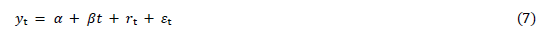 where: yt is the variable under study, α is the intercept (constant), ßt is the time trend, rt is a random walk with zero mean, St is the error term.