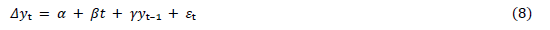 where: yt is the variable under study, Ayt is the first-order difference of the variable (yt -yt-1), t is a time trend (optional), a and ß are coefficients of the constant and the time trend, respectively, y is the coefficient associated with the level of the lagged series (checks if the series has a unit root), St is the random error term.